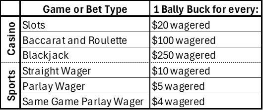 - Apuestas regulares: 1 Bally Buck por cada $10 apostados